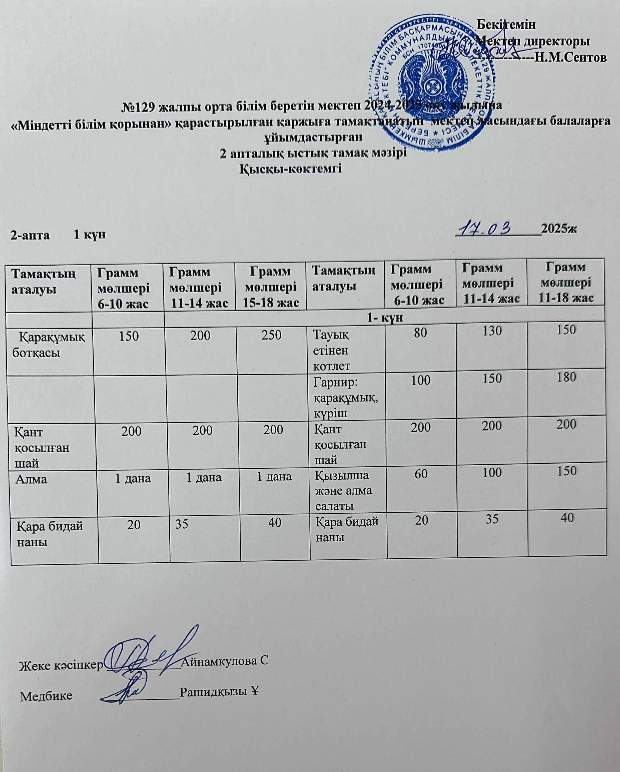 17.03.2025ж Бір күндік асхана мәзірі » №129 жалпы орта білім беретін мектеп