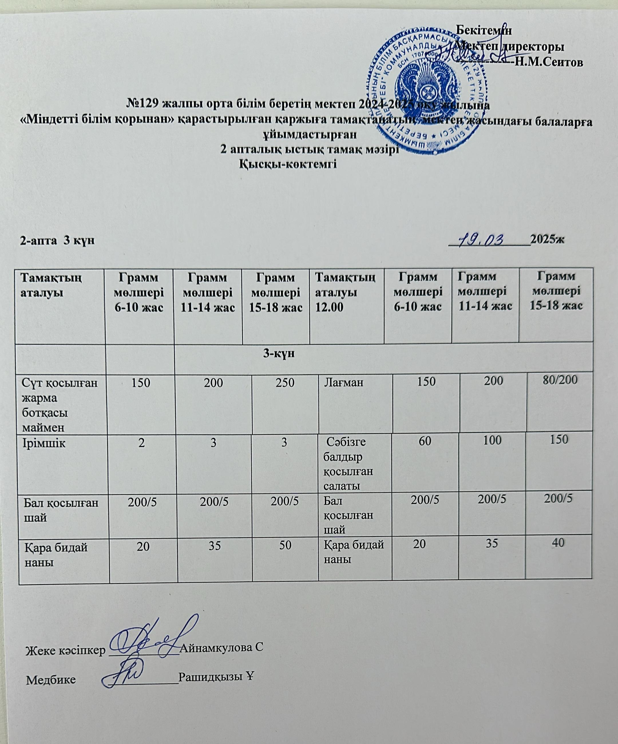 19.03.2025ж Бір күндік асхана мәзірі » №129 жалпы орта білім беретін мектеп