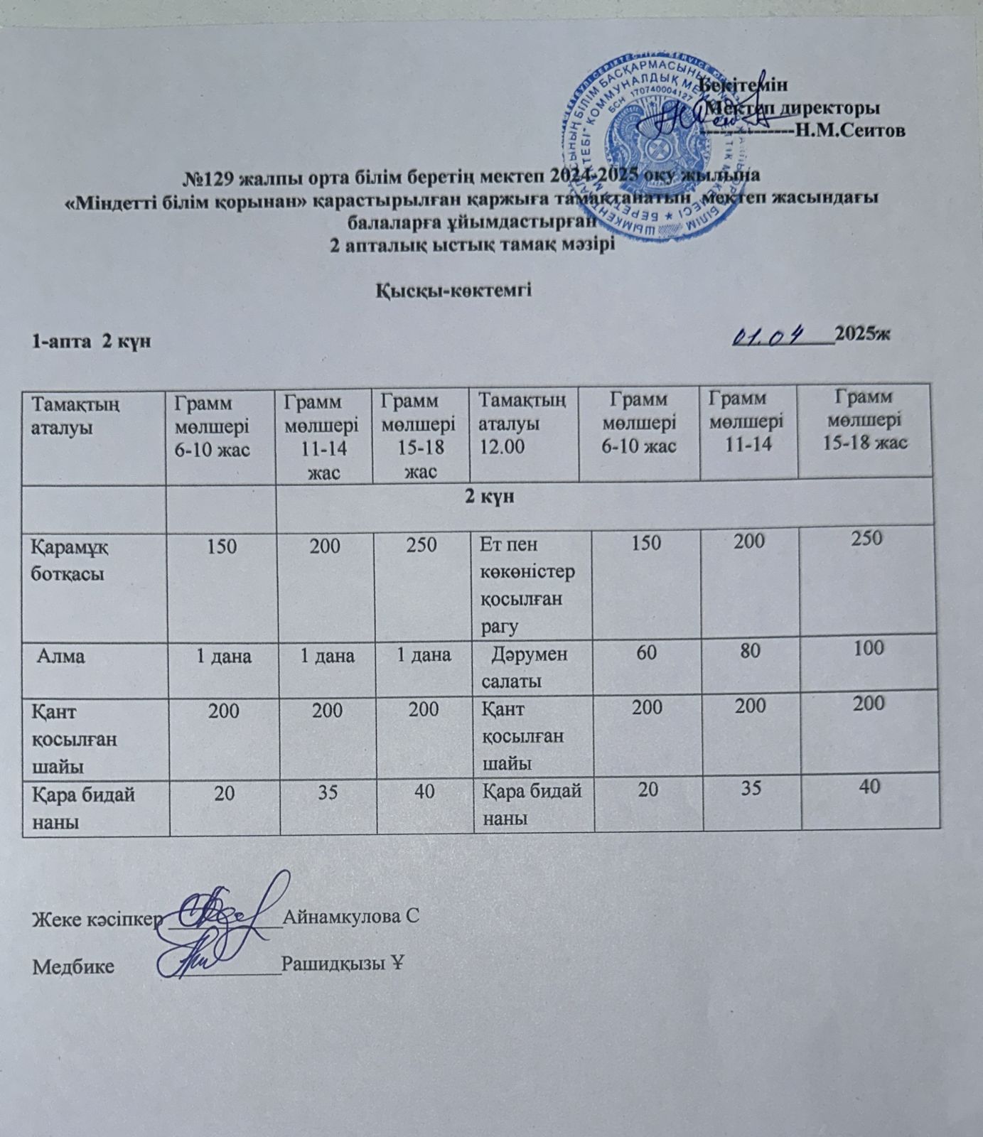 01.04.2025ж Бір күндік асхана мәзірі » №129 жалпы орта білім беретін мектеп