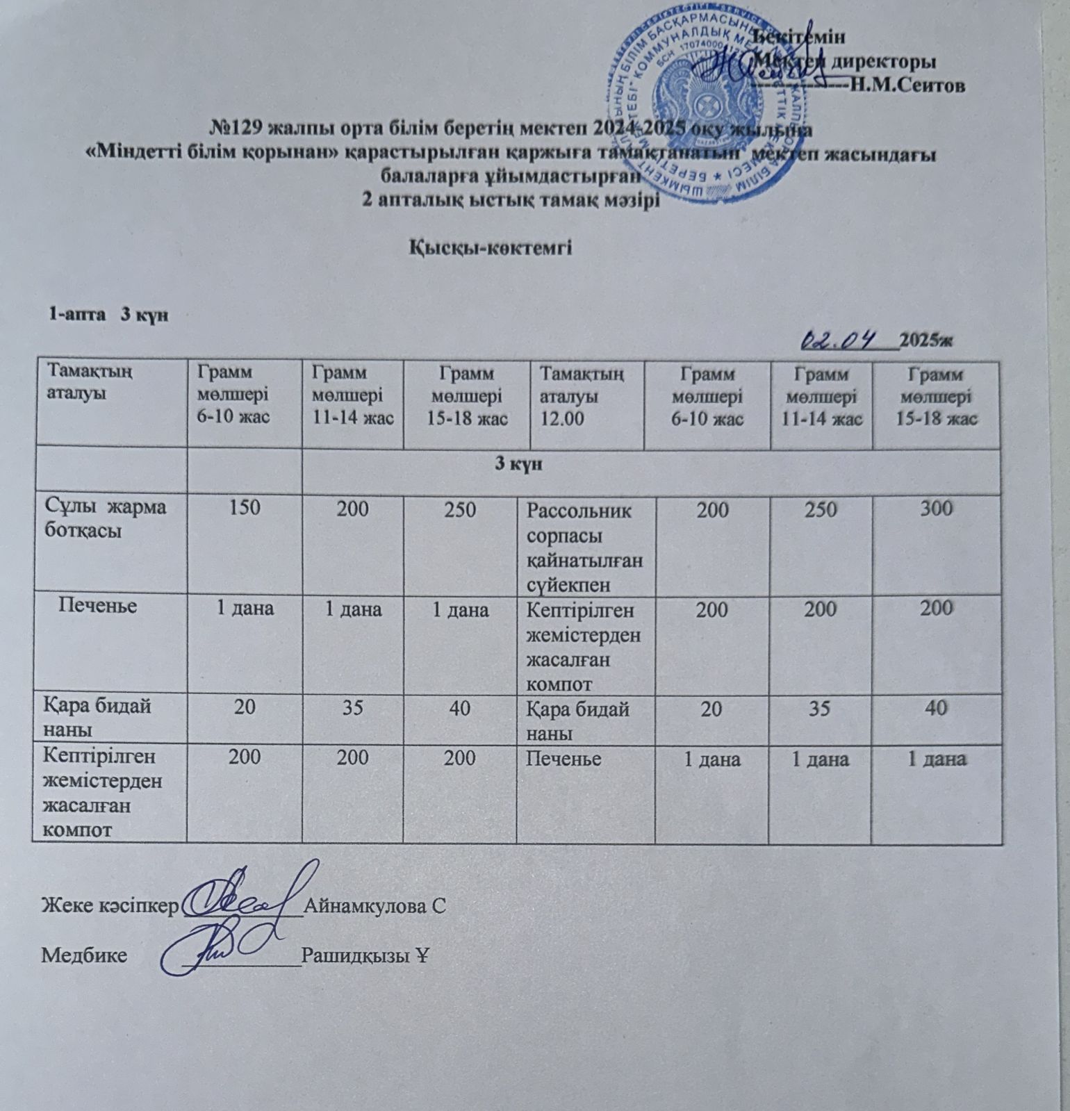 02.04.2025ж Бір күндік асхана мәзірі » №129 жалпы орта білім беретін мектеп