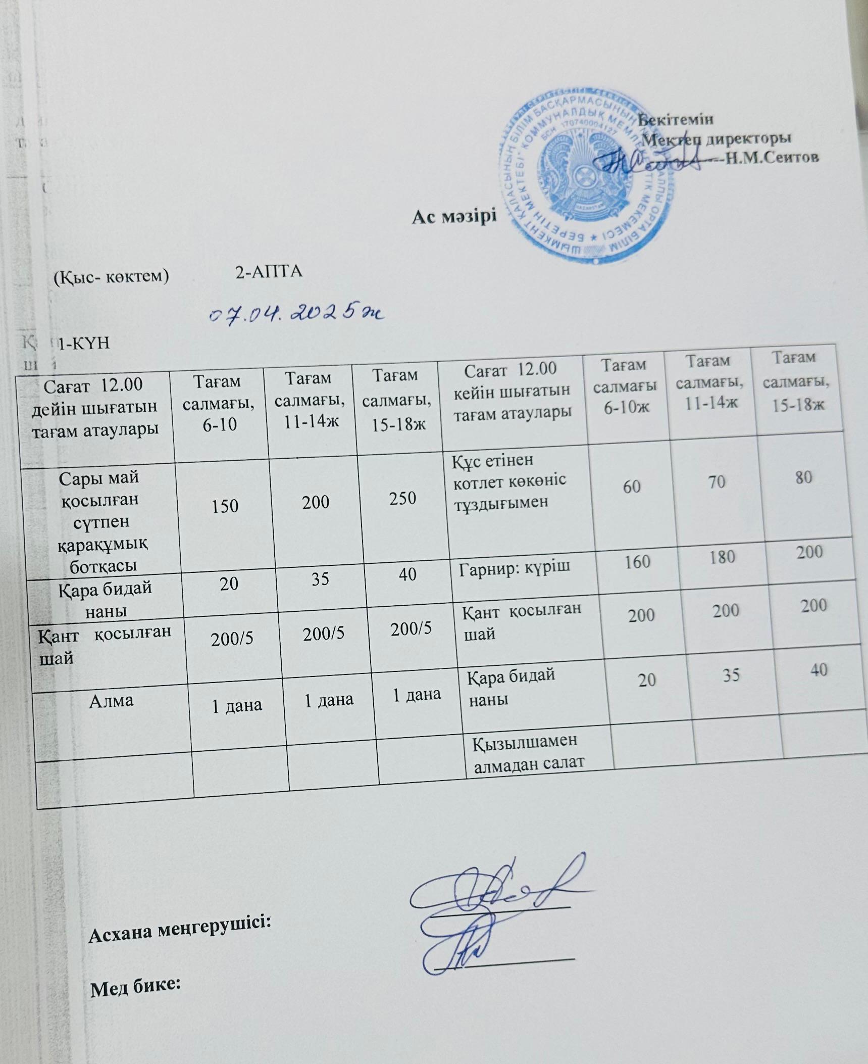 07.04.2025ж Бір күндік асхана мәзірі