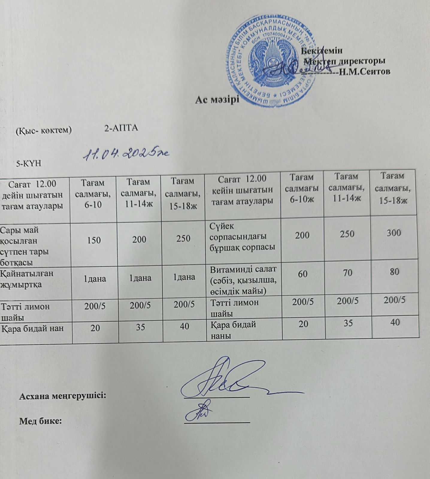11.04.2025ж Бір күндік асхана мәзірі