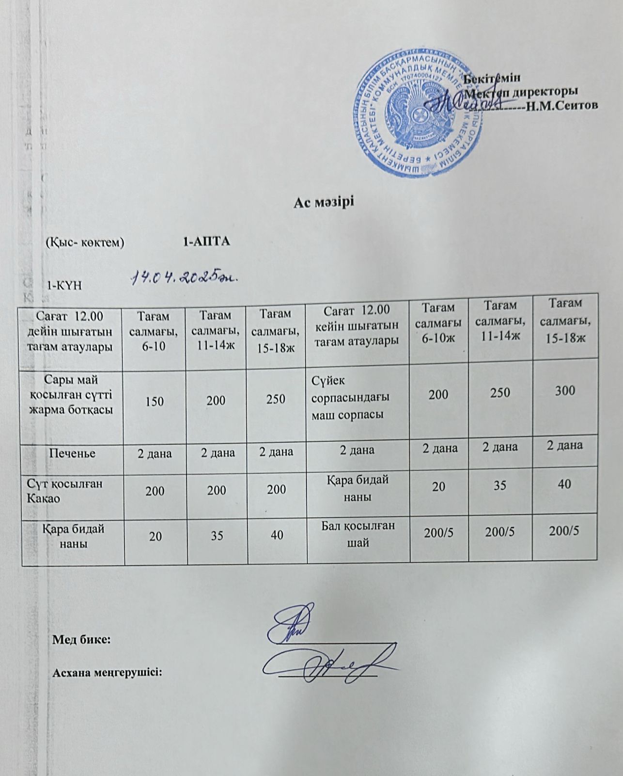 14.04.2025ж Бір күндік асхана мәзірі » №129 жалпы орта білім беретін мектеп