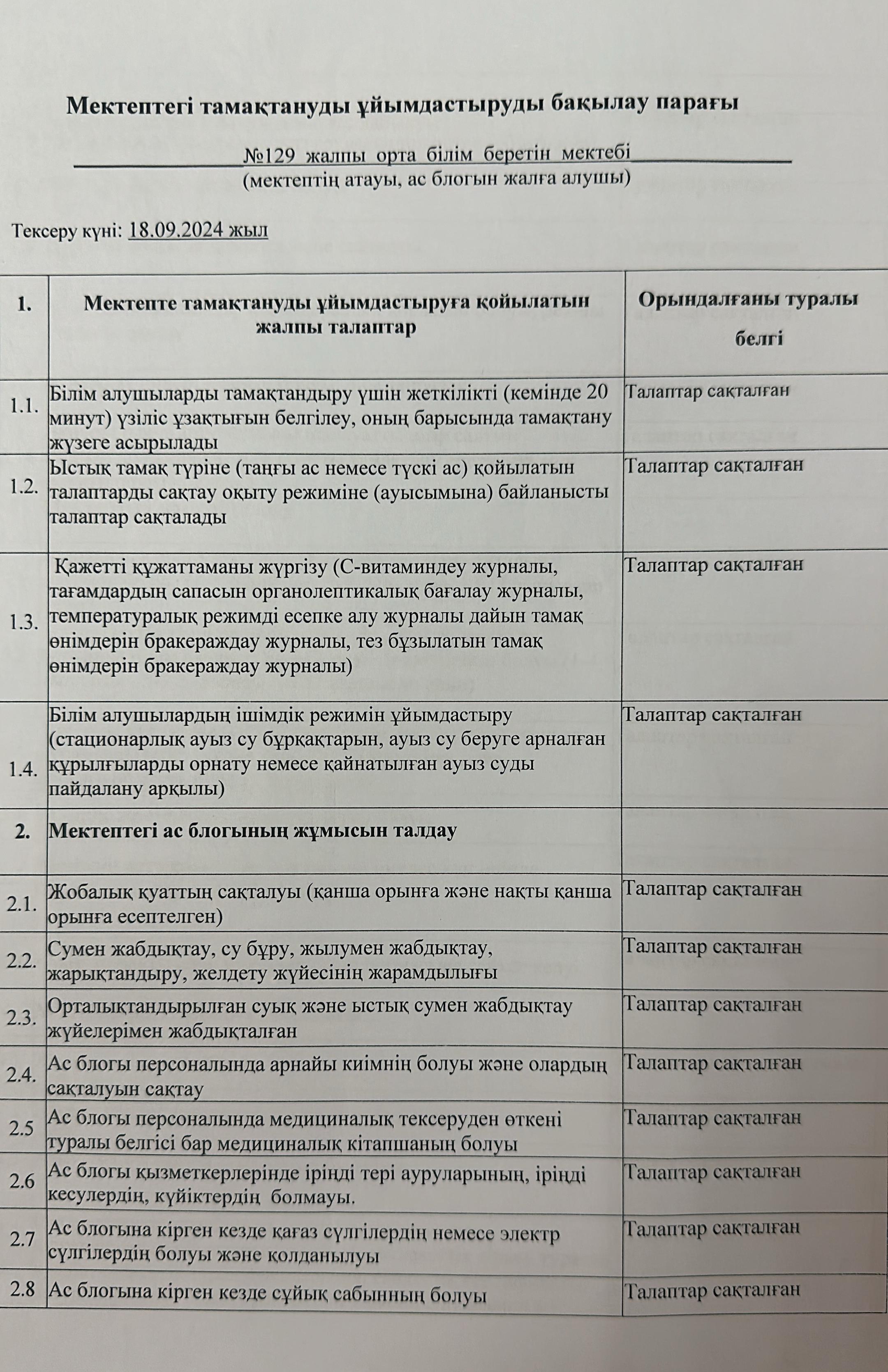 19 қыркүйек 2024 0 1 2 3 4 5 19.09.2024ж. Мектептік тамақтандыру сапасына мониторинг жүргізу жөніндегі комиссия қорытындысы